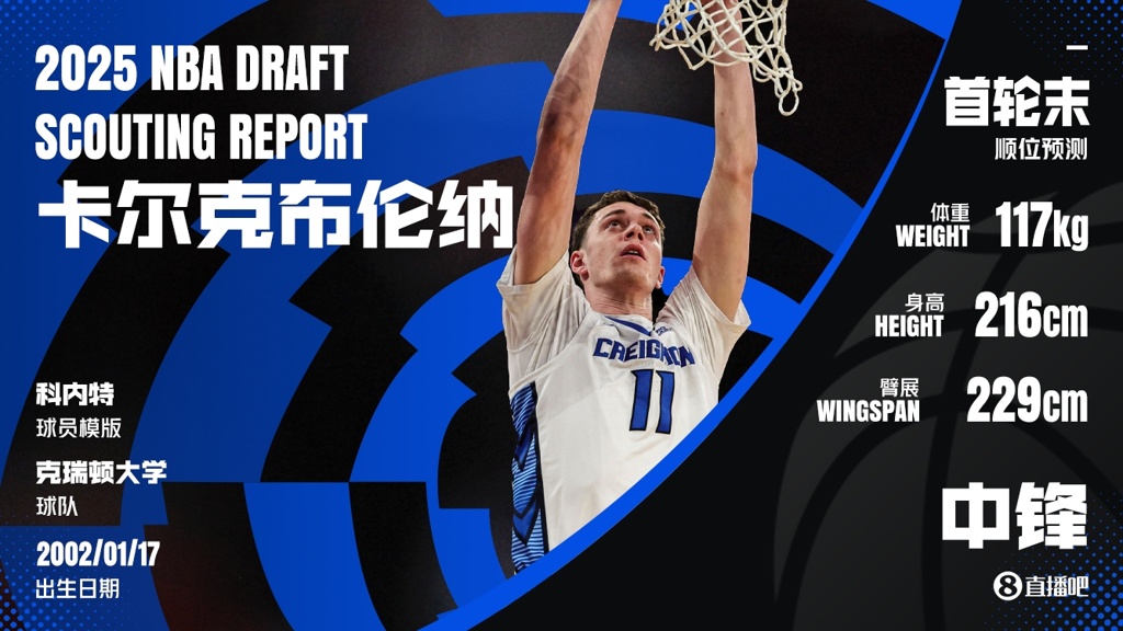 卡尔克布伦纳今年23岁,身高2米16,臂展2米29,司职中锋,他大五赛季为球队出战了35场比赛,场均34.4分钟,可以得到19.2分8.7篮板2.7盖帽,投篮命中率65.3%,三分命中率34.4%,罚球命中率68.1%。