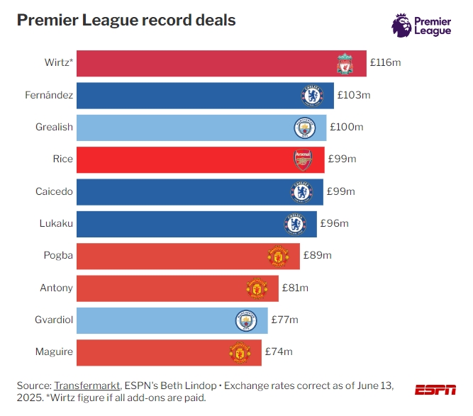 英超引援转会费top10(数据来源于德转,汇率截至6月13日。维尔茨转会费包含附加费用。单位:英镑):