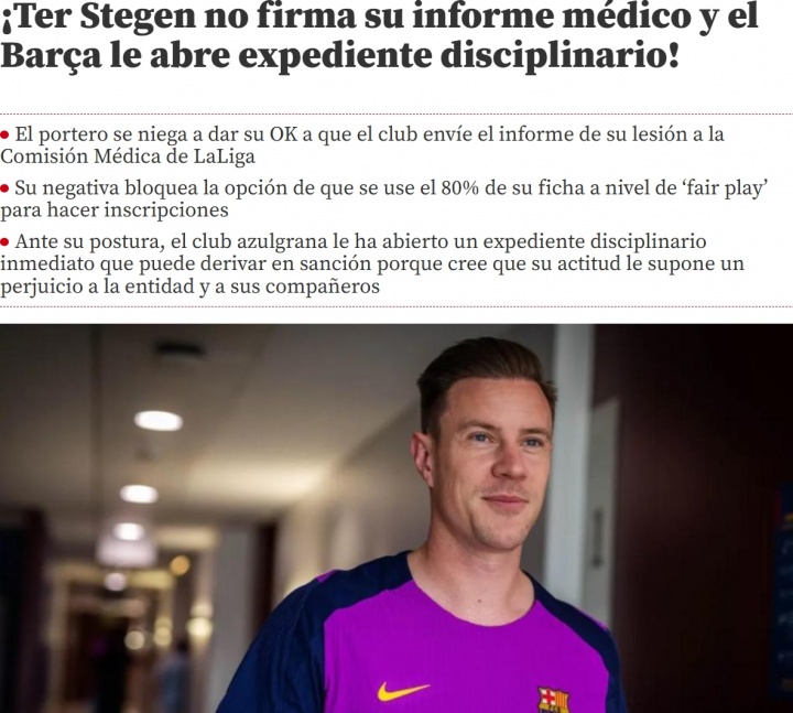 特尔施特根上个月完成了腰部手术,预计长期伤缺。据特尔施特根的亲信人士透露,他拒绝签署医疗同意书,这样一来巴萨无法将伤情报告提交给西甲医疗委员会,以评估其伤势的严重程度。球员的医疗报告被视为私人信息,如果没有其本人的授权,巴萨无法将报告共享给西甲联赛部门。