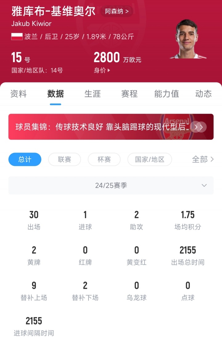 基维奥尔现年25岁,波兰籍后卫,身高1米89。他于2023年冬窗以1950万欧的转会费加盟阿森纳,至今代表枪手各项赛事68场贡献3球5助攻。