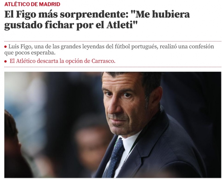 08月27日讯 据《世界体育报》报道,葡萄牙名宿菲戈近日在参加活动时接受了采访,并坦白:除了职业生涯曾效力的巴萨、皇马之外,他还曾有加盟马竞的想法。