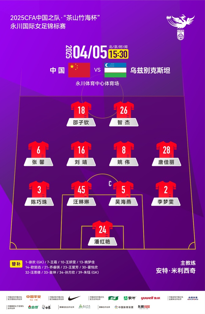 04月05日讯 今天下午15:30,永川女足邀请赛半决赛,中国女足vs乌兹别克斯坦女足,赛前双方的首发阵容出炉。